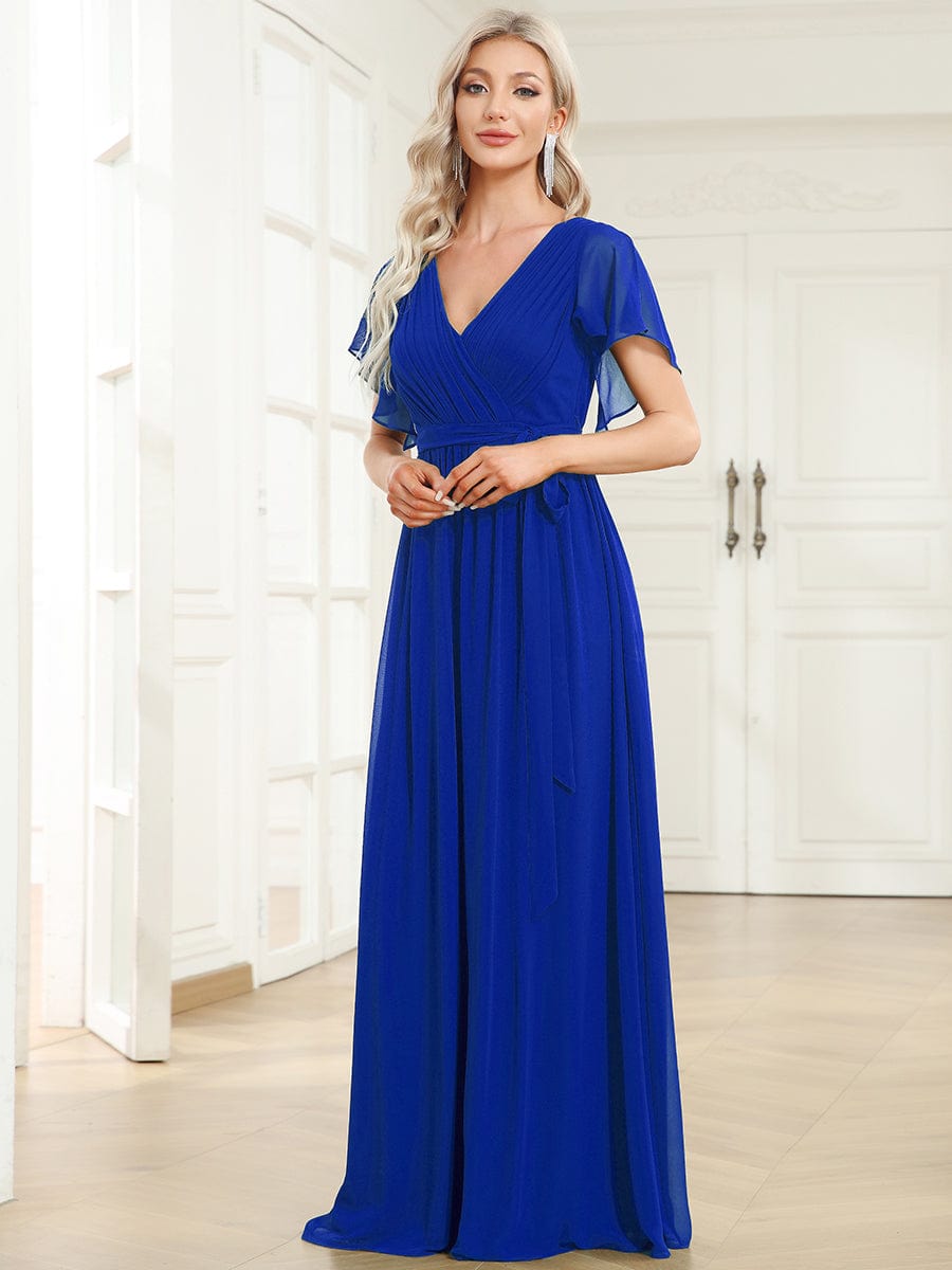 This sophisticated bridesmaid dress features flowing pleated layers of chiffon and a flattering tie-waist. Flutter sleeves, a plunging v-neckline, and an A-line silhouette exude a timeless elegance worthy of every picture.