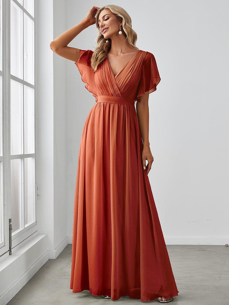 This classic A-line evening dress features pleated chiffon layers, v-neckline, light flutter sleeves, and a flowing silhouette, making it timeless and sophisticated. Pair it with black or metallic heels.