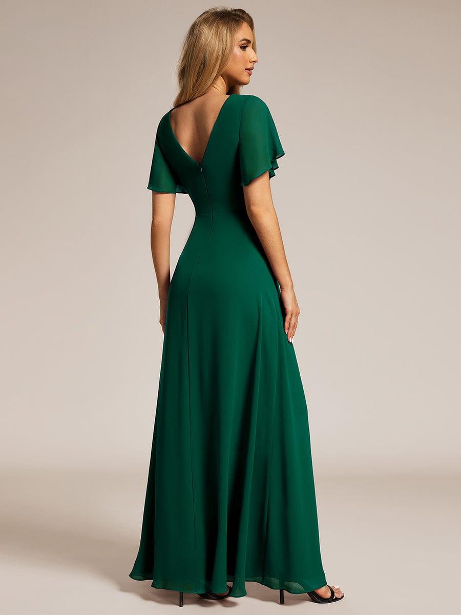 Designed with a V-neck and high slit, this A-line chiffon bridesmaid dress showcases ruffle sleeves and a high waist. The pleated details add a refined touch, making it an ideal pick for a chic wedding look.