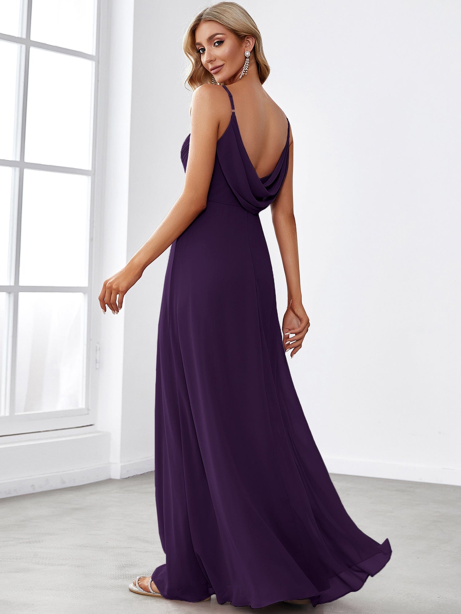 This elegant and chic bridesmaid dress is extremely flattering for any body type. It is crafted with flowy chiffon fabric that moves with you. It consists of a sweetheart neckline, a pleated bodice, a draped low back, and ends with a floor-length skirt suitable for dancing the night away!
